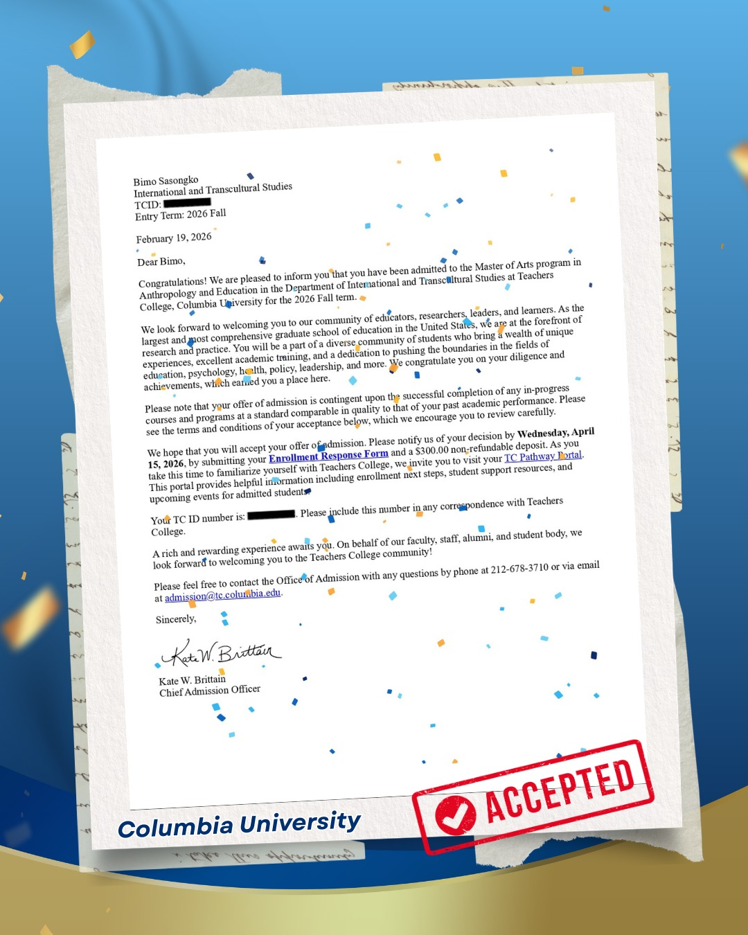 Bimo Sasongko resmi diterima di Columbia University, melalui Teachers College, Columbia University, untuk program Master of Arts in Anthropology and Education. Prestasi ini menjadi refleksi dari dedikasi, kapasitas akademik, dan komitmen kuat dalam pengembangan keilmuan serta pendidikan di tingkat global 🌍📚