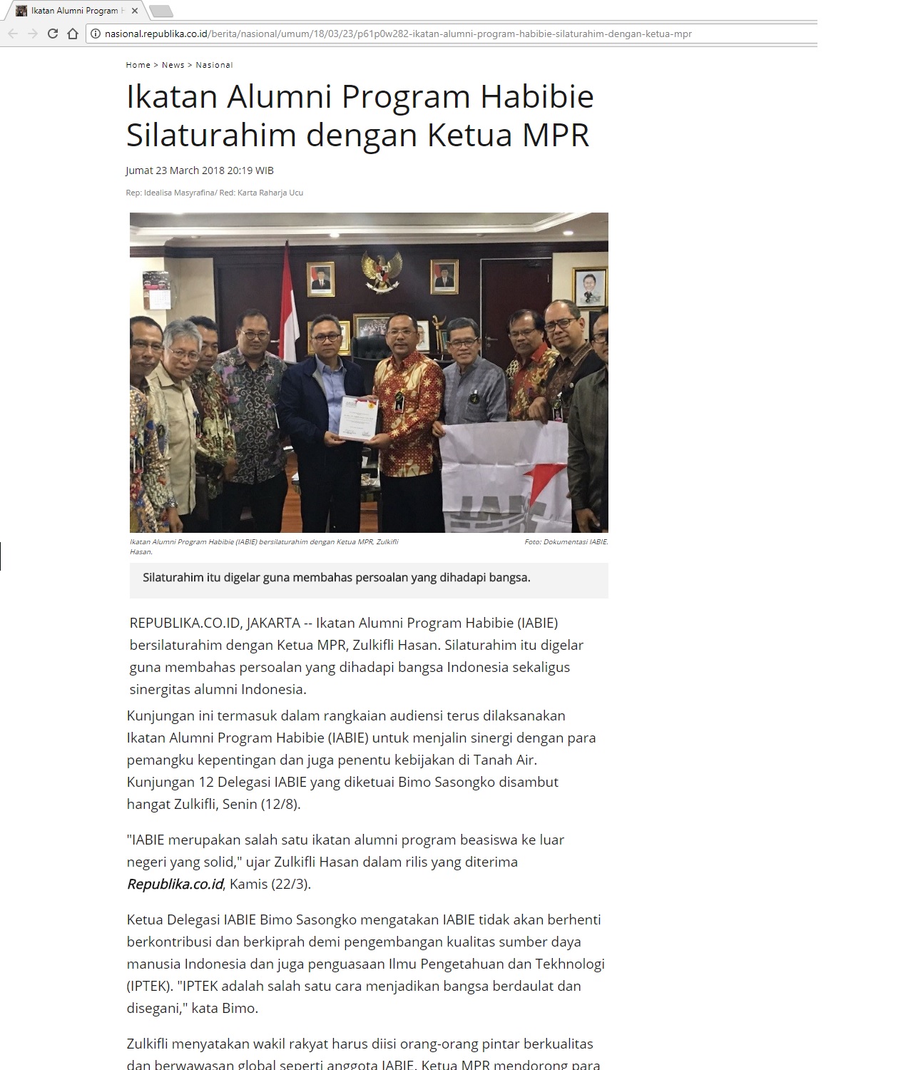 Kunjungan ini termasuk dalam rangkaian audiensi terus dilaksanakan Ikatan Alumni Program Habibie (IABIE) untuk menjalin sinergi dengan para pemangku kepentingan dan juga penentu kebijakan di Tanah Air. Kunjungan 12 Delegasi IABIE yang diketuai Bimo Sasongko disambut hangat Zulkifli, Senin (12/8).