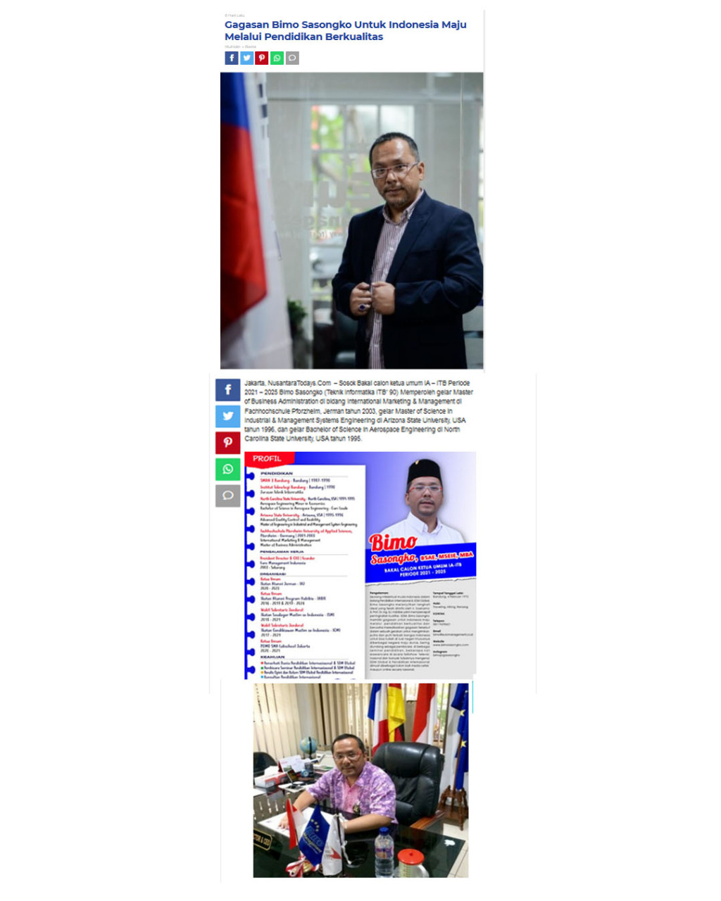 – Sosok Bakal calon ketua umum IA – ITB Periode 2021 – 2025 Bimo Sasongko (Teknik Informatika ITB’ 90) Memperoleh gelar Master of Business Administration di bidang International Marketing & Management di Fachhochschule Pforzheim, Jerman tahun 2003, gelar Master of Science in Industrial & Management Systems Engineering di Arizona State University, USA tahun 1996, dan gelar Bachelor of Science in Aerospace Engineering di North Carolina State University, USA tahun 1995.